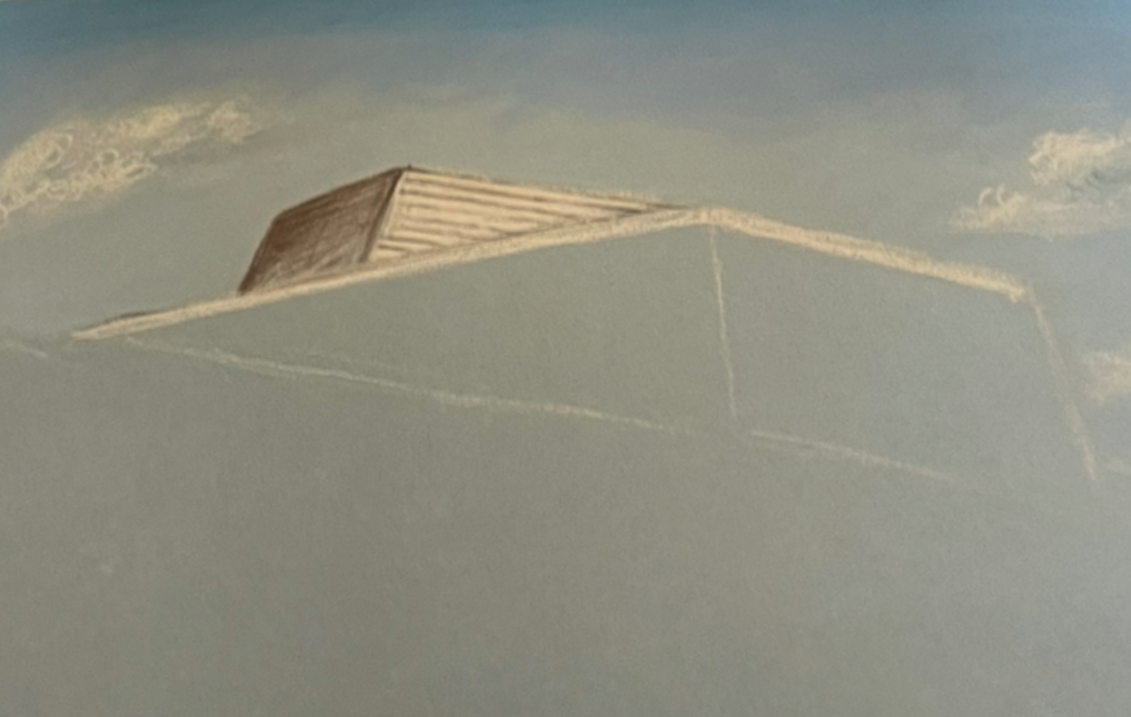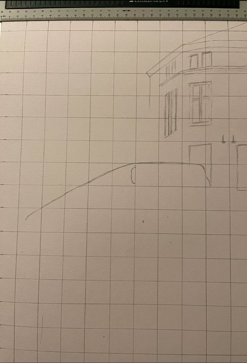 Arbeidsprosessen startet med en lett skisse av motivet ved hjelp av hvit pastelblyant på gråblått papir. Rutenettet hjalp til med å plassere hovedformen presist, og linjene ble tegnet svakt for å kunne tilpasses underveis. Først ble himmelen lagt inn med lyse blå og grå toner i tørrpastell, og deretter begynte jeg å bygge opp selve bygningen med forsiktige skygger og konturer. Jeg fokuserte på lysretning og perspektiv for å gi struktur til de skrå flatene. De lyse og mørke områdene ble gradvis justert for å skape dybde og volum. Denne første fasen handlet om å finne balansen mellom form og rom, samtidig som jeg la grunnlaget for de videre lagene med farger og detaljer.