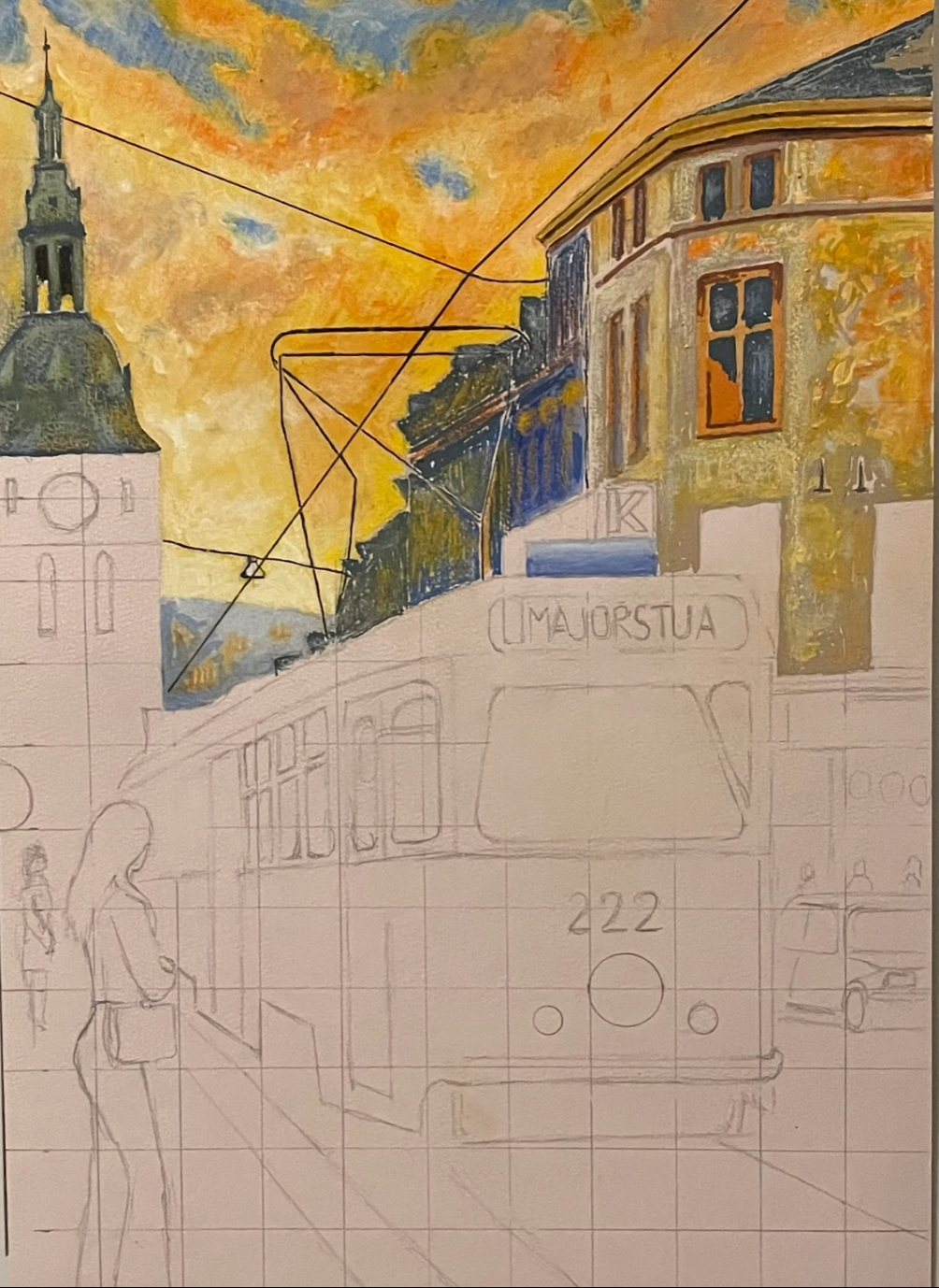 Disse bildene viser prosessen med et akrylmaleri i utvikling. Kunstneren starter med å legge et varmt og dynamisk bakgrunnslag i gule, oransje og blå toner som skaper en livlig himmel og stemningsfull belysning. Deretter males bygningene gradvis inn, med bruk av kontraster og lagvis oppbygging for å gi dybde og tekstur. De svarte linjene markerer trikkens ledninger og gir struktur til komposisjonen. Akrylmalingen brukes både tynt og pastost for å variere overflatene, mens fargene smelter sammen på en energisk, nesten impresjonistisk måte. Denne fasen viser hvordan motivet begynner å ta form – med klare konturer, lysvirkninger og byens karakter trinn for trinn..