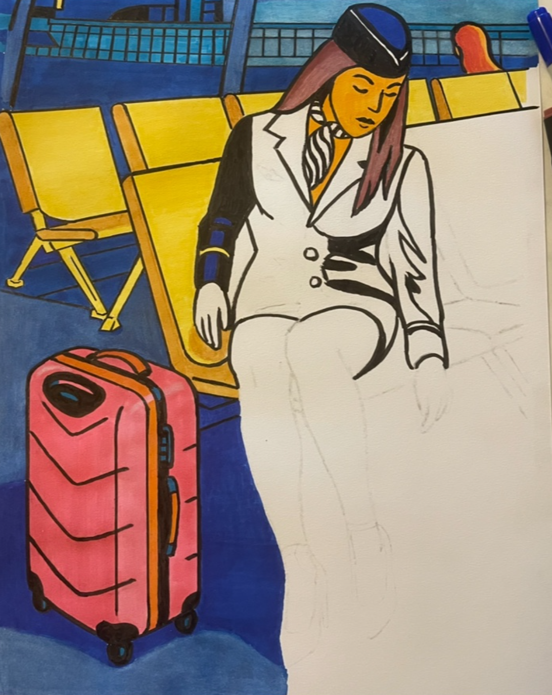 I dette arbeidet ønsket jeg å fange et stille øyeblikk midt i bevegelse – en flyvertinne som hviler i terminalen. Skissen ble først tegnet med blyant for å fastsette komposisjon og perspektiv, før jeg la konturer med Micron fineliner for et presist uttrykk. Fargeleggingen ble gjort med alkoholbaserte markere, som gir jevne overganger og sterke kontraster. Jeg valgte klare komplementærfarger – gule stoler, blå bakgrunn og en rosa koffert – for å skape energi og fokus. Stilen er inspirert av popart og moderne illustrasjon, der rene linjer og flater står i sentrum. Illustrasjonen uttrykker ro, reiselyst og refleksjon i et travelt miljø.