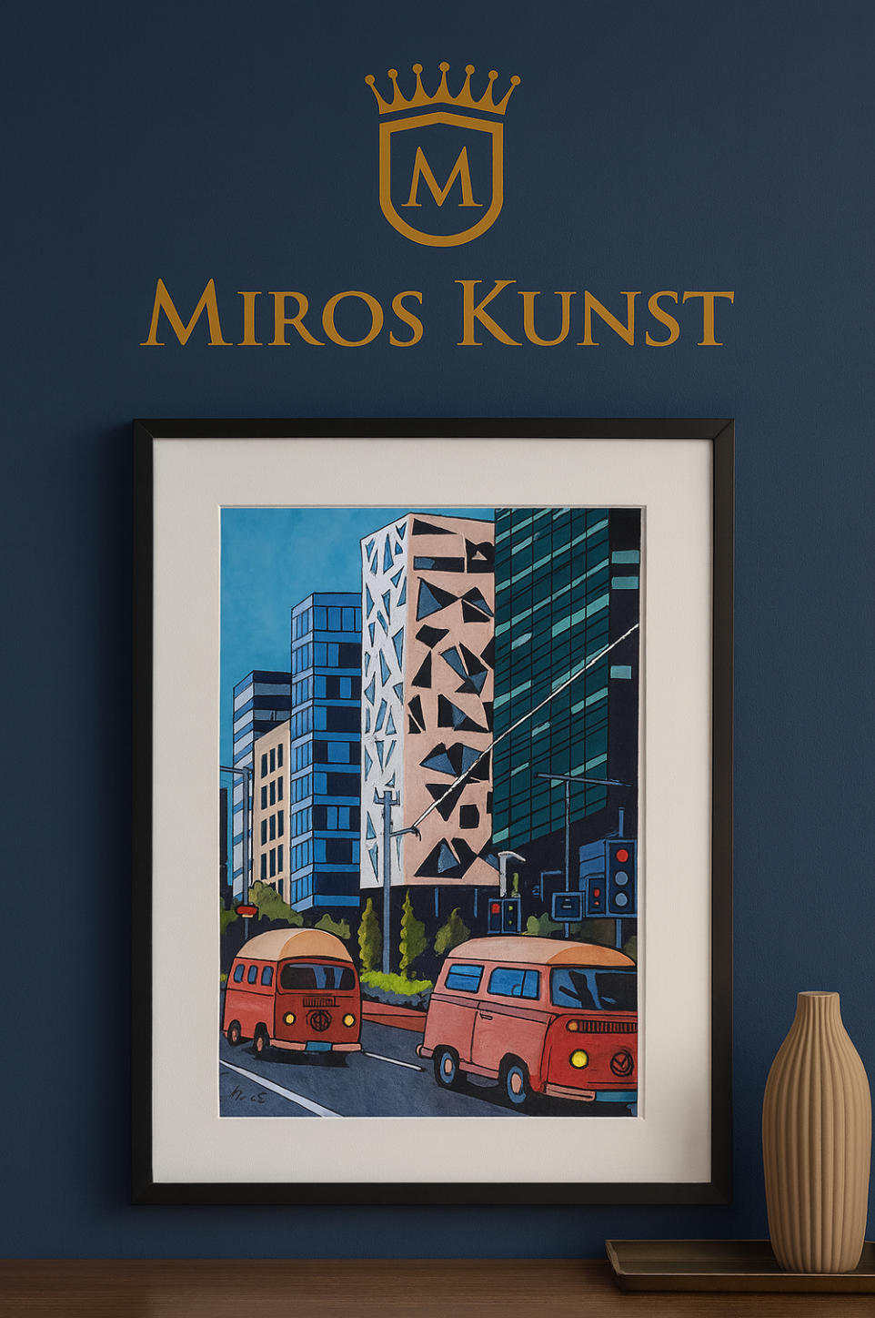 Tidenes reise startet med skissing og nøyaktig oppmåling i rutenett for å sikre riktige proporsjoner og perspektiv. Først ble bygningene i bakgrunnen tegnet opp og fargelagt med alkoholbaserte markere i kalde blåtoner og varme beige nyanser. Deretter ble de ikoniske VW-bilene lagt til i forgrunnen, som symboler på bevegelse og nostalgi. Den første bilen ble fargelagt i livlig oransje, og gir et sterkt blikkfang mot den moderne byfasaden. Gradvis vokser miljøet frem med trær, trafikklys og gateelementer som gir dybde og liv til scenen. Arbeidet kombinerer presis arkitektonisk struktur med en varm, fortellende stemning – en visuell reise gjennom tid, bevegelse og kontraster mellom nytt og gammelt.
