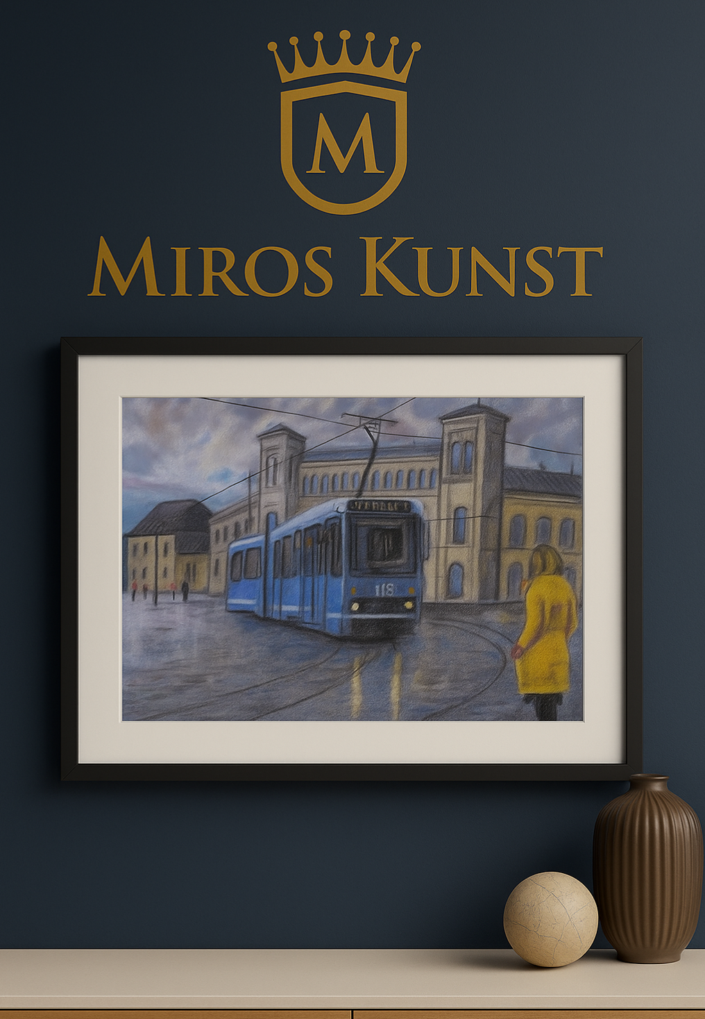 Arbeidsprosessen begynte med å utvikle trikken og omgivelsene videre med tørrpastell på gråblått papir. Først ble bygningen og bakgrunnen justert for å skape mer dybde og atmosfære. Deretter fokuserte jeg på trikken, hvor blåtoner og grå skygger ble brukt for å forme volum og perspektiv. Detaljer som vinduer, lys og nummerskilt ble lagt til for å gi et realistisk uttrykk. Jeg jobbet gradvis med å bygge opp fargene i bakken, der reflekser fra lys og regn ble gjenskapt med korte, blandede strøk. I siste fase ble figuren i gul kåpe lagt til for å tilføre liv, kontrast og menneskelig nærvær. Resultatet ble en balansert komposisjon med både byliv, stemning og lysrefleksjoner.