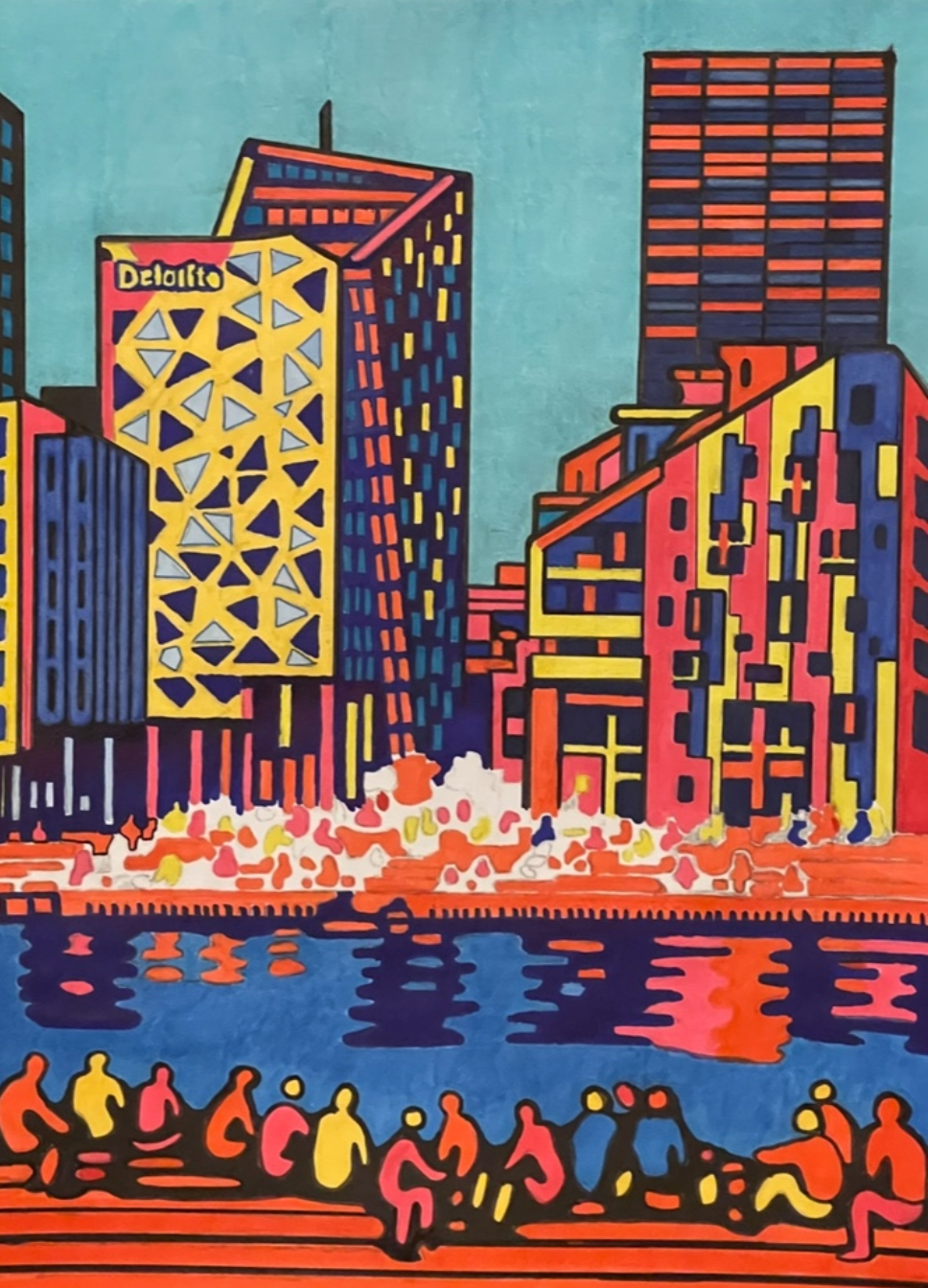 Etter at skissen var ferdig, begynte jeg å fylle inn farger ved hjelp av alkoholbaserte markere. Jeg startet med himmelen i turkisblå for å skape en ren og moderne bakgrunn. Deretter arbeidet jeg med bygningene, der sterke primærfarger som rød, gul og blå ble brukt for å skape kontrast og energi. Markerne gjorde det mulig å oppnå jevne overganger og skarpe kanter, samtidig som fargene fikk en klar og mettet effekt. Jeg la ekstra vekt på de svarte konturene for å fremheve formene og gi motivet et grafisk, nesten popart-preget uttrykk. Til slutt ble menneskene og refleksjonene i vannet fylt inn med varme toner for å skape liv og balanse mellom byens struktur og menneskelig aktivitet.