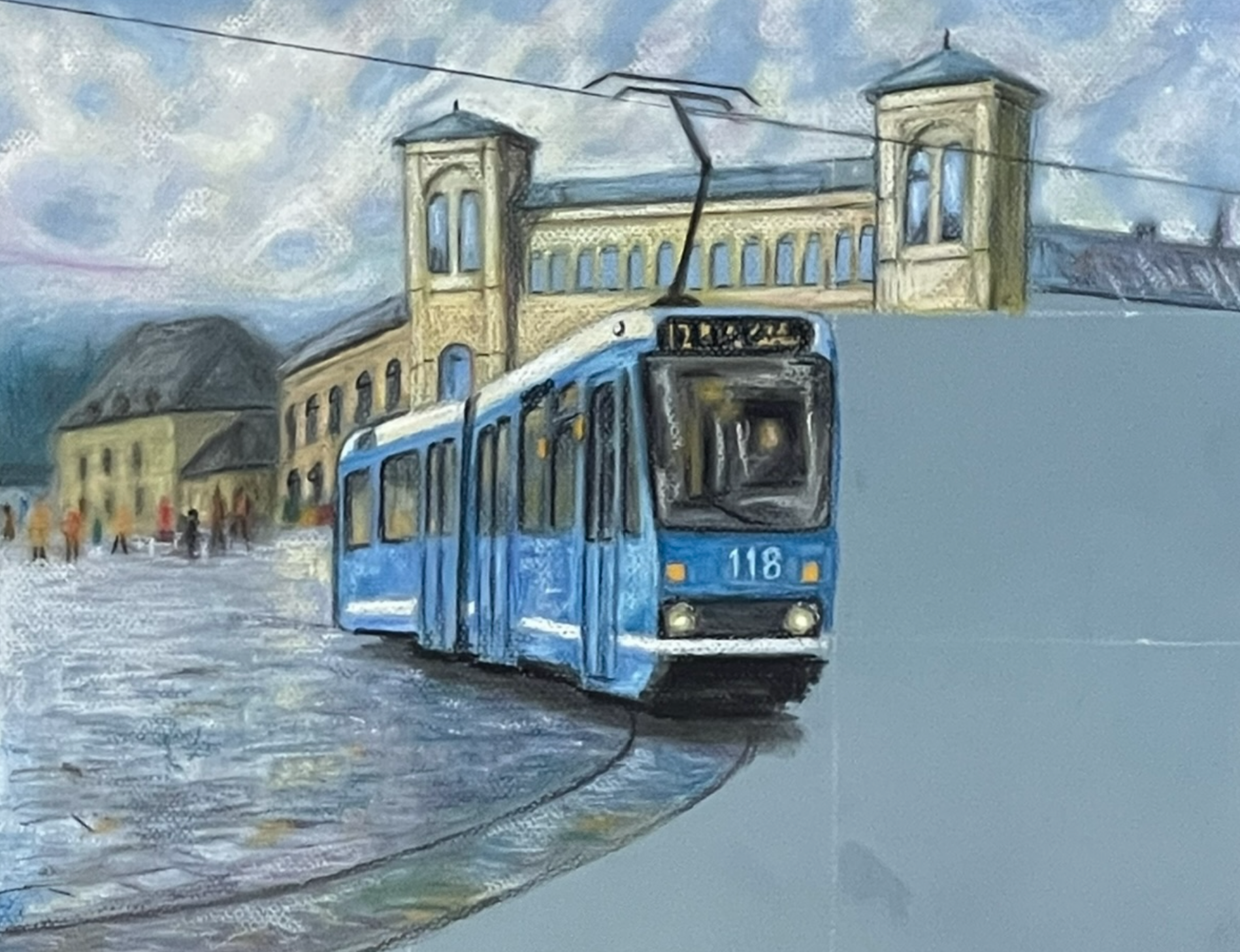 Skissering startet med en enkel inndeling av arket i ruter, for å sikre riktig proporsjon og plassering av motivet. Deretter ble hovedformene skisset opp med hvit pastelblyant på gråblått papir, som gir en fin kontrast til de senere fargene. Jeg begynte med himmelen, hvor jeg brukte tørrpastell i lyse og kalde toner for å bygge opp en myk, skyfull bakgrunn. Etterpå gikk jeg videre til bygningen, der gule og grå nyanser ble lagt lagvis for å gjenskape arkitekturens struktur og lyssetting. I neste steg ble flere detaljer lagt til, inkludert trær og skygger. Til slutt startet jeg på trikken i front, hvor blåtoner og mørke konturer skapte dybde og perspektiv. Prosessen krevde nøyaktighet og gradvis oppbygging av fargelag.